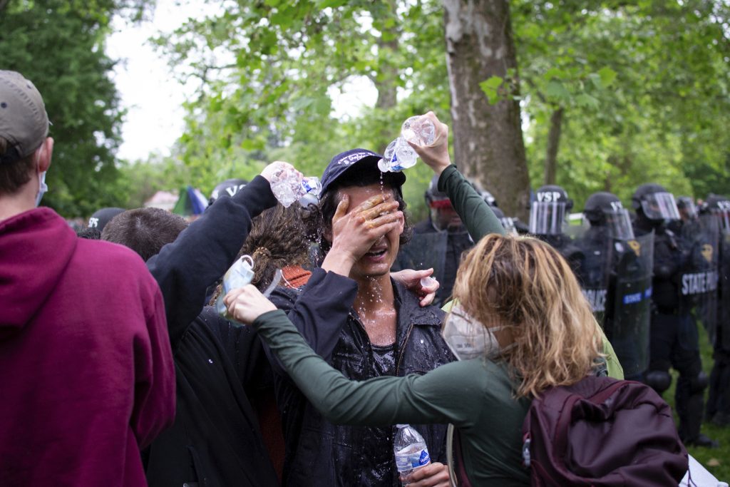 Featured image of a pepper-sprayed UVA students getting their eyes flushed out by Levi Vonk