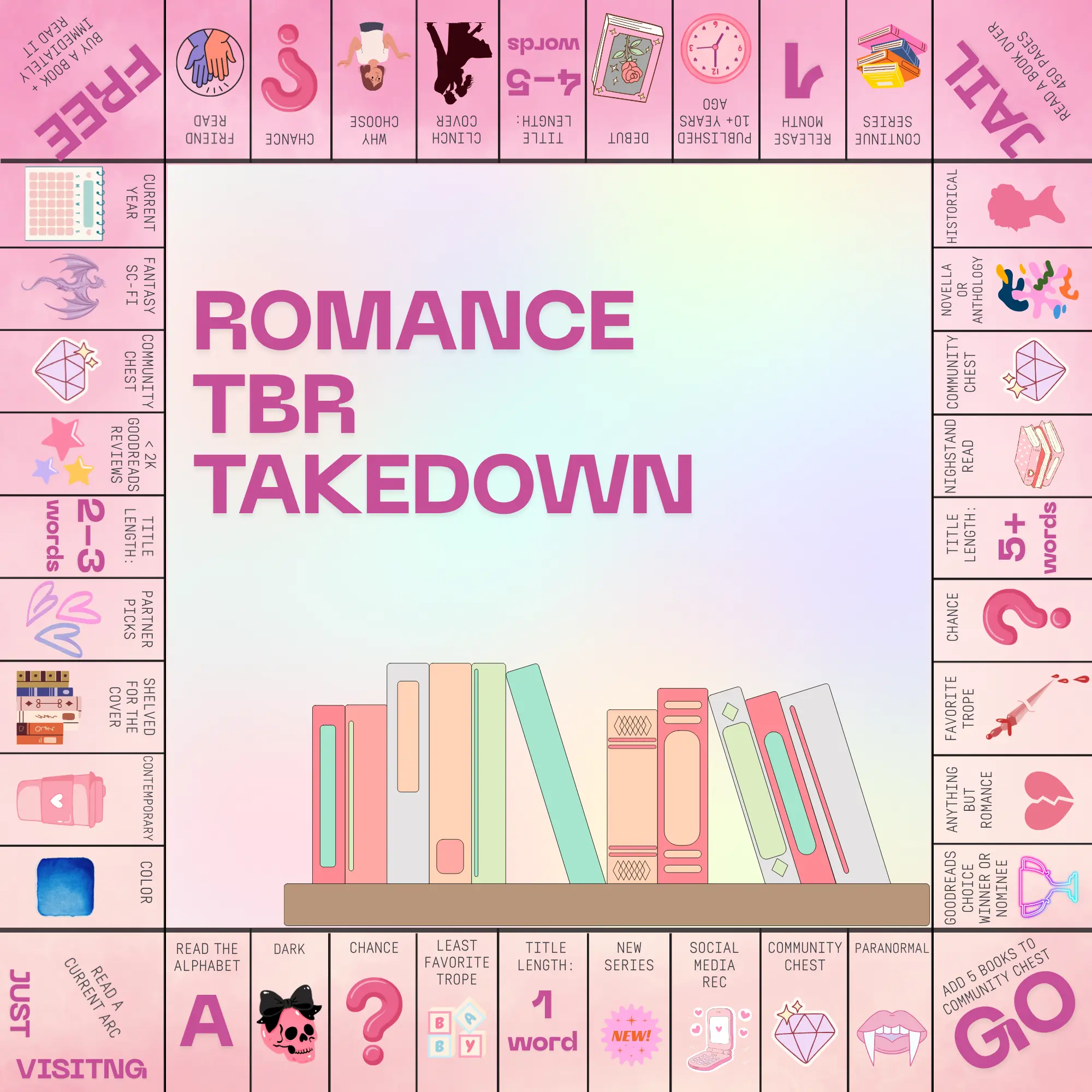 I have a couple dynamic categories on the board: Color, Read the Alphabet, Least Favorite/Favorite Tropes, and Release Month. These are designed to change as I land on them. Example: Once I land on Read the Alphabet for A, I pick a book with a title, author name, or character name that starts with A. Once I finish, I’ll edit the square to B.