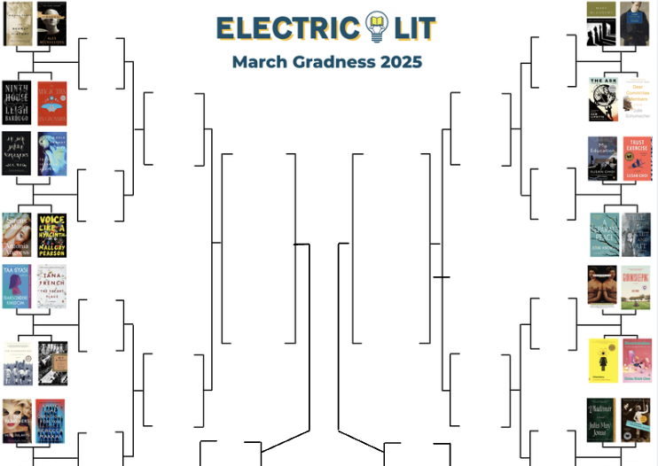 Firstly, we have prizes! Download the bracket here, fill it out with your picks, then email it to us at books@electricliterature.com by 9 AM Eastern on Monday, 3/24 as a .pdf, .jpg, or .png file, using subject line BRACKET: followed by the title of the book you’ve chosen as the winner (e.g., “BRACKET: The Secret History”). The person whose bracket is closest to the real results will win a free manuscript consultation with an EL editor and a Reading into Everything tote! Two runners-up will each receive a tote as well. We’ll reach out to our winners the week after results are in.