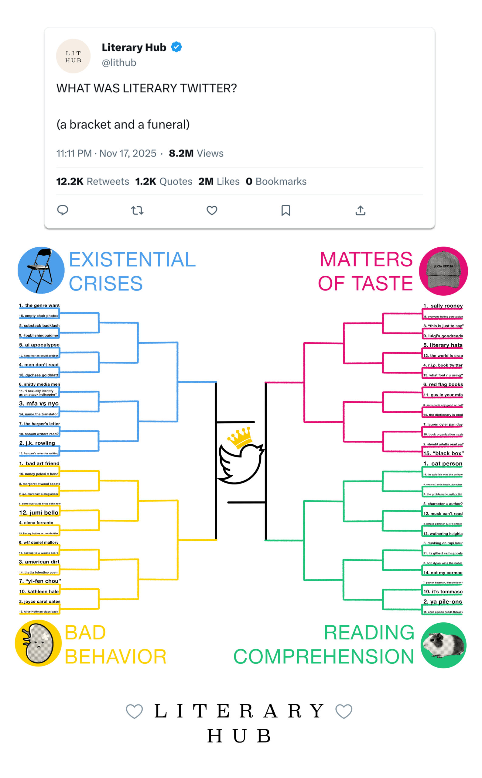 Does a version of this community still exist on X, in some corner? Or on Bluesky with the joke scolds, or on Mastodon with the Linux hackers, or on Threads with the voice-forward brands? Perhaps. But the particular microblogging alchemy of Literary Twitter of the late 2000s to early 2020s will probably never again exist. Where else were so many opinionated readers and writers sloshing in the same warm pool water, where the frenzied, silly posting merged real life stakes with absolute, terrifying chaos? Where else could award winning writers pop off about nothing at all, and nobodies could rattle the ivory towers? Literary Twitter was a horrible, beautiful place. And now, for better or for worse, it’s gone.