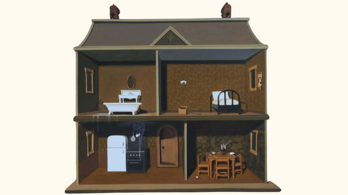 It starts here: in the kitchen. Not a full-size kitchen, of course, but rather a miniature replica of a kitchen, a tiny kitchen with a tiny table where two tiny dolls sit, blank-eyed and smiling and ready to eat an invisible meal.