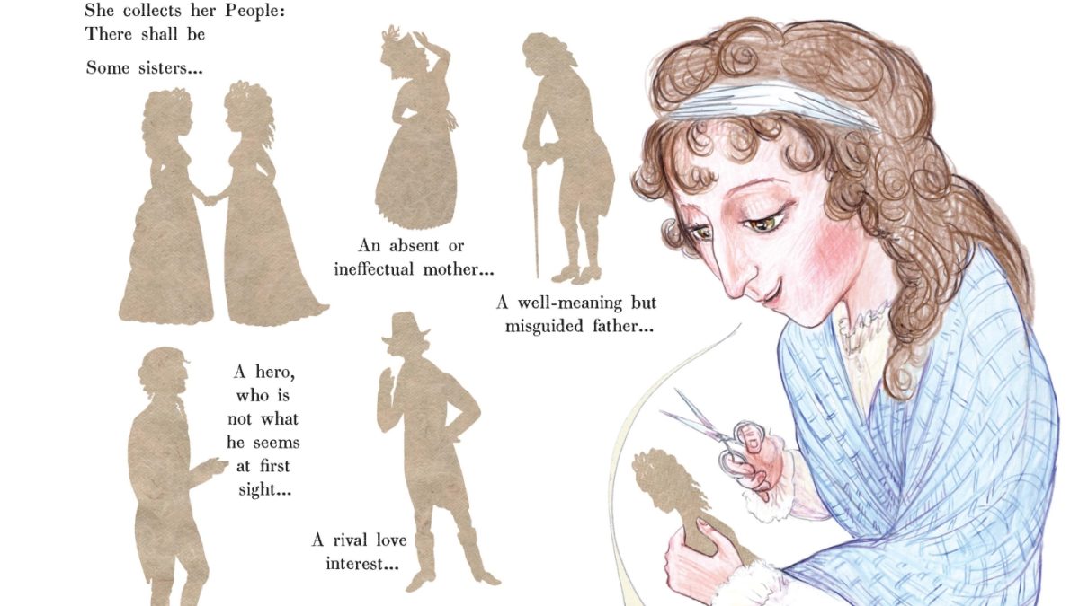 Evans is the author-artist of an equally compelling 2015 graphic biography about Rosa Luxemburg. This latest book, which parses out the internal and external workings of a very different kind of life, is built around clips and snippets. These come from Evans’ extensive research of biographies, academic studies and related Jane Austen texts and archives, as well as excerpts from Austen’s novels, poems and the letters exchanged between the novelist and her (mostly) loved ones. Many of Austen’s letters were famously burned after her death, by her sister, Cassandra, who was likely intending to preserve her beloved’s reputation. Hence, even this already incongruous record is full of holes.